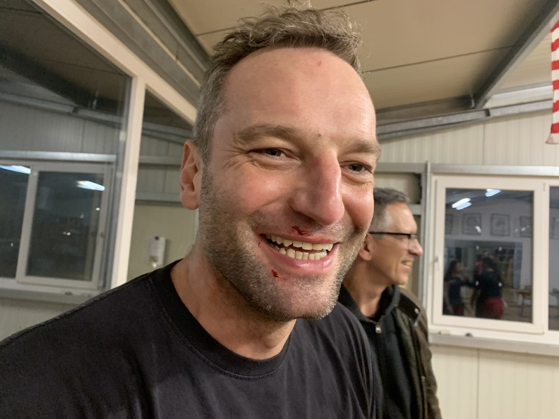 Als erster war Alex an der Reihe, der trotz seiner teils schweren Verletzungen in der Vergangenheit keine Zweifel aufkommen ließ, dass er seine Themen in der waffenlosen Abwehr beherrschte. Ob